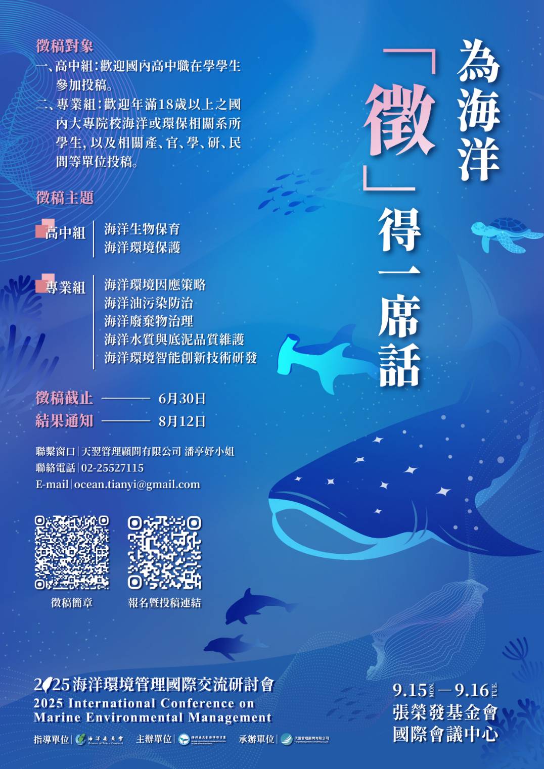 (三)投稿形式分為口頭發表(Oral Panel)與海報發表 (Poster),審查通過者將獲邀於研討會期間發表或展示,並有機會角逐「海洋希望之聲獎」之榮譽。