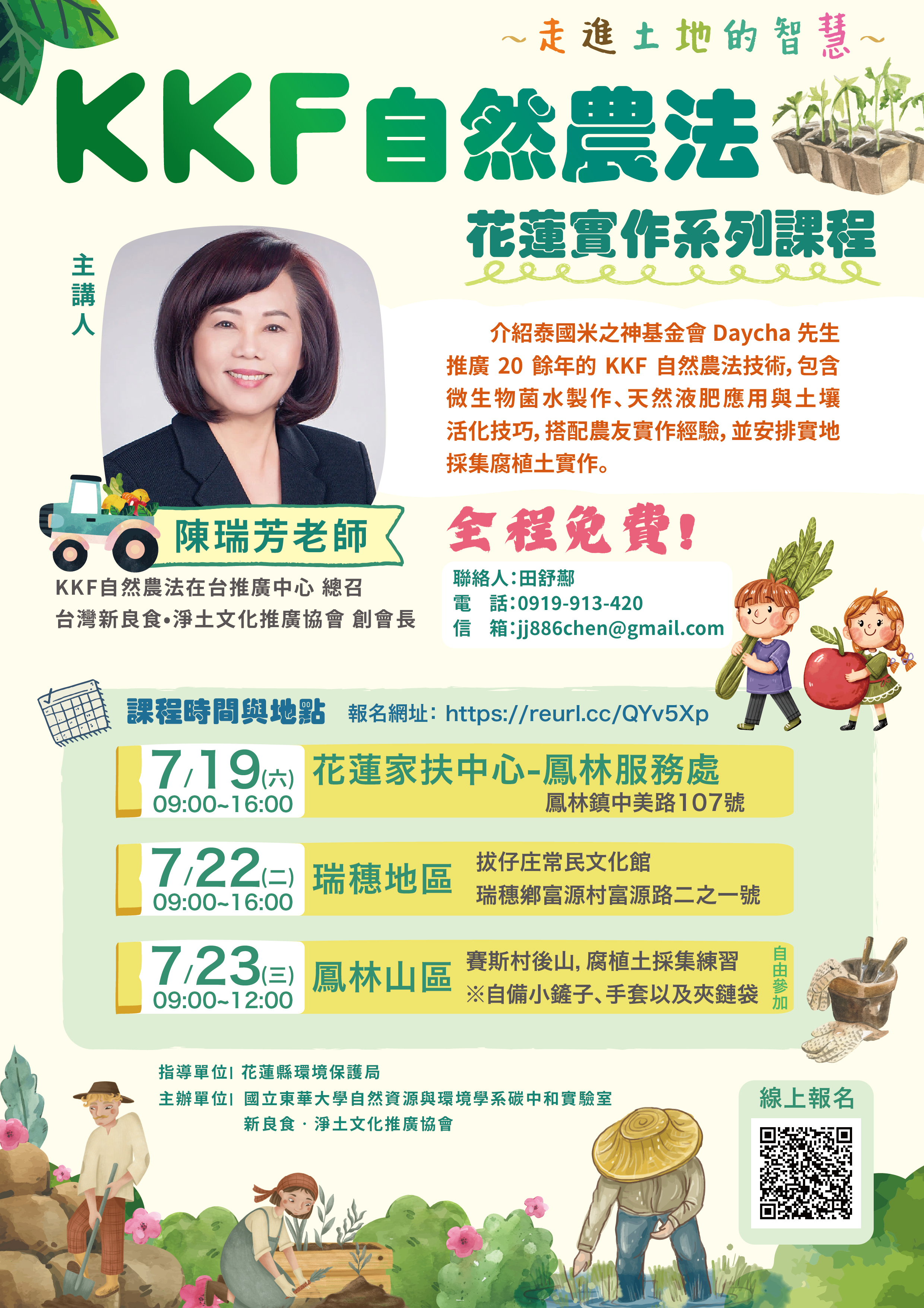 一、本系列課程將介紹由泰國米之神基金會(Khao Kwan Foundation)創辦人 Daycha Siripatra 先生所推動之 「KKF自然農法」實作經驗,其核心理念為「回歸自然、尊重土地」,強調透過微生物共生與土壤自我修復機制,以實現環境友善、農作健康與農民自主之永續目標。